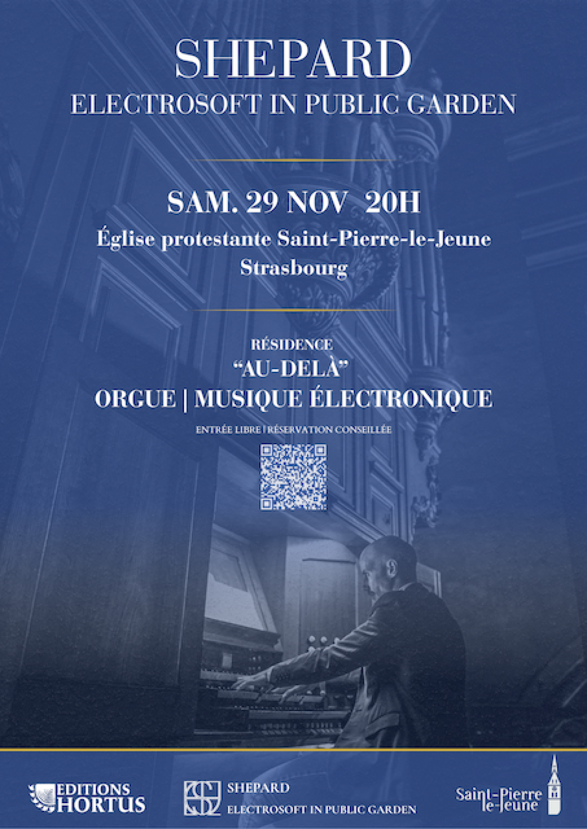 Après plusieurs semaines de résidence à l’Église protestante Saint-Pierre-le-Jeune, SHEPARD ELECTROSOFT IN PUBLIC GARDEN vous invite à découvrir AU-DELÀ, un concert de clôture qui mêleles timbres de l’orgue et les textures de la musique électronique.